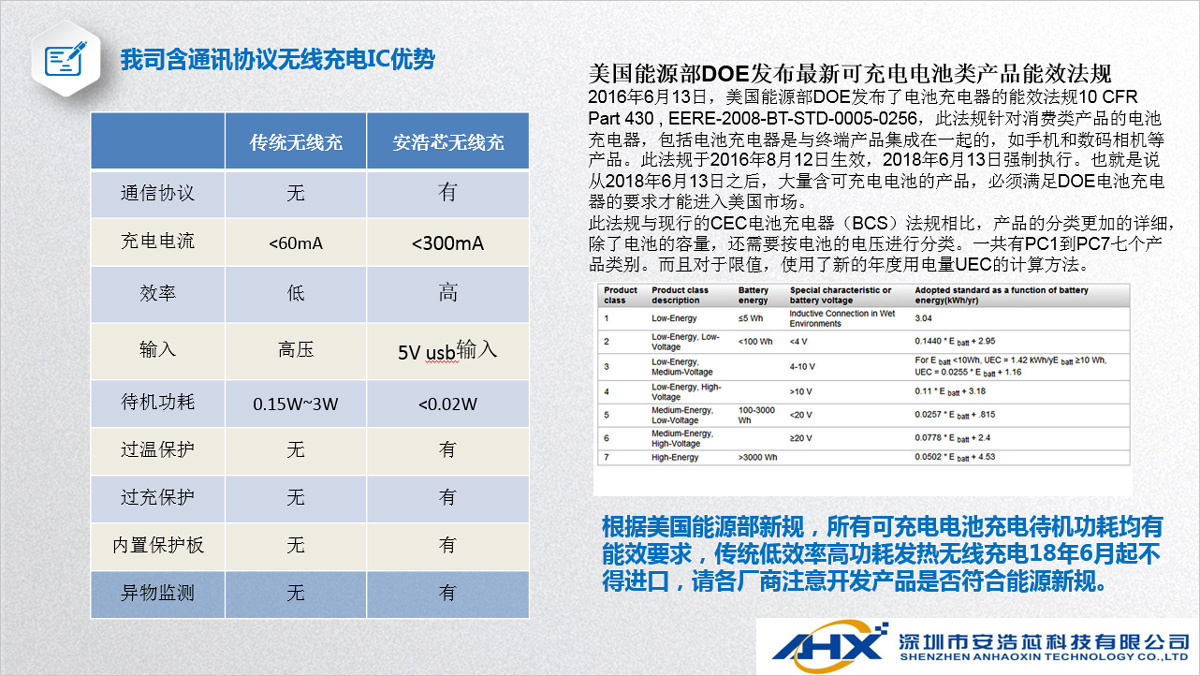 我司無線充電IC方案具有體高、成本優(yōu)勢(shì)明顯、應(yīng)用電路簡單等特點(diǎn),發(fā)射和接收IC集成度高,帶有通訊協(xié)議,具有異物識(shí)別、過充保護(hù)、過放保護(hù)、短路保護(hù)等功能。
